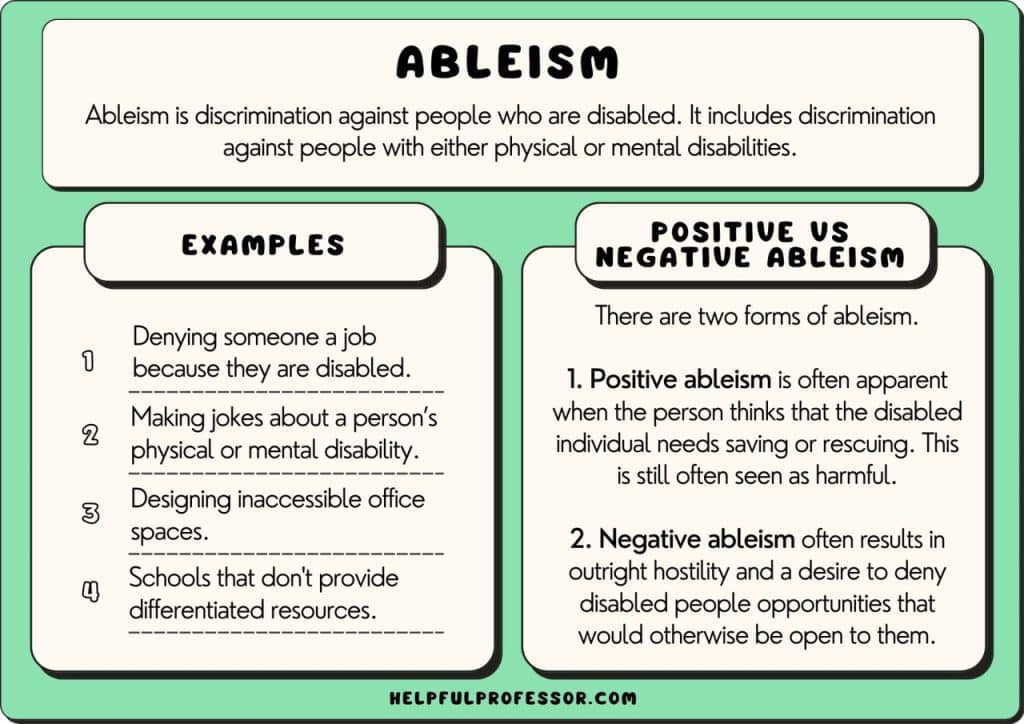 Definition: Ableism is discrimination against people who are disabled. It includes discrimination against people with physical, mental, and cognitive disabilities.