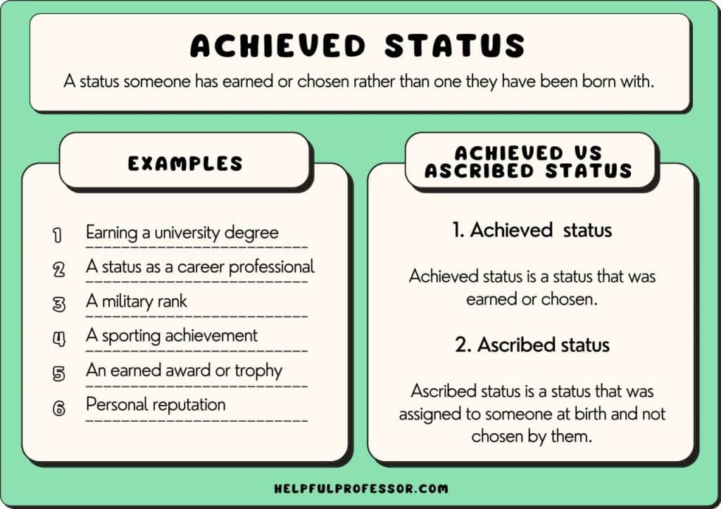 Definition: Achieved status is a social status someone has earned or chosen rather than the one hey have been born with.