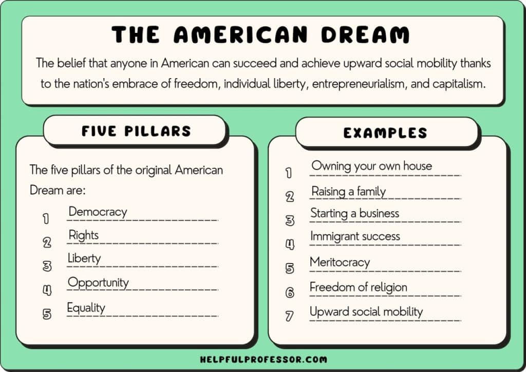 Definition: The belief that anyone in American can achieve upward social mobility thanks to the nation’s embrace of freedom, individual liberty, entrepreneurialism, and capitalism.