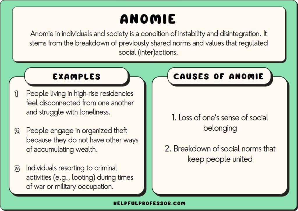 Definition: Anomie in individuals and society is a condition of instability and disintegration. It stems from the breakdown of previously shared norms and values.