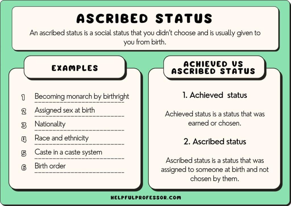 Definition: An ascribed status is a social status that you didn’t choose and is usually given to you from birth.