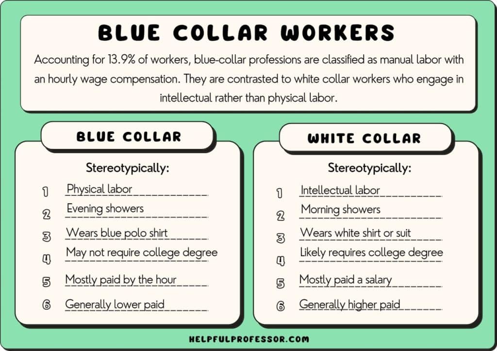 Definition: Blue-collar professions are classified as manual labor jobs with hourly wage compensation. They are contrasted to white-collar workers who stereotypically engage in mostly intellectual labor.
