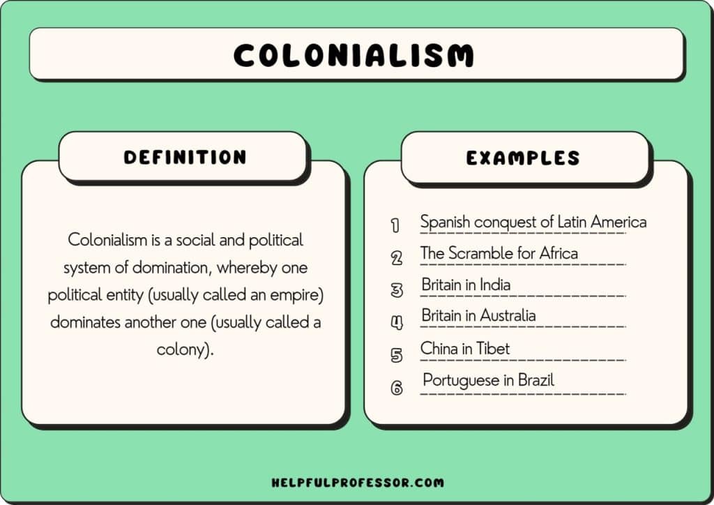Definition: Colonialism is a social and political system of domination, whereby one political entity (an empire) dominates another one (a colony).
