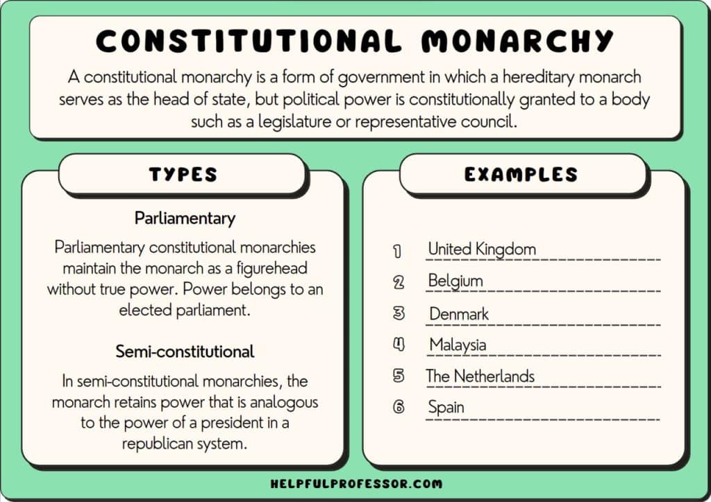 Definition: A form of government in which a hereditary monarch serves as the head of state but political power is also constitutionally granted to another body through a constitution.