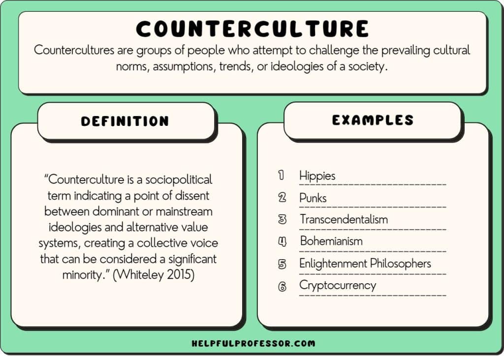 Definition: Countercultures are groups of people who attempt to challenge the prevailing cultural norms, assumptions, trends, or ideologies of a society.