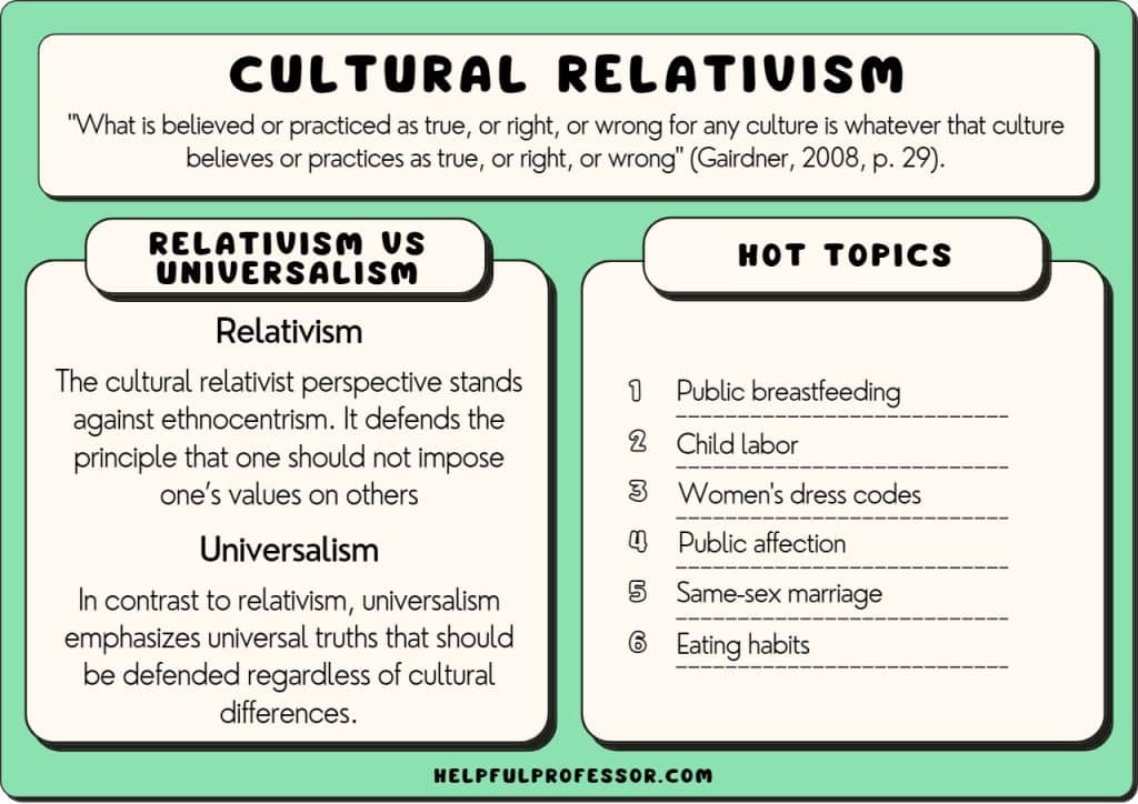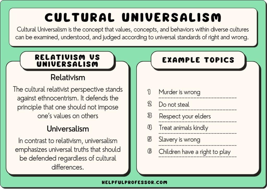 Definition: Cultural Universalism is the concept that values, concepts, and behaviors within diverse cultures can be examined, understood, and judged according to universal standards of right and wrong.