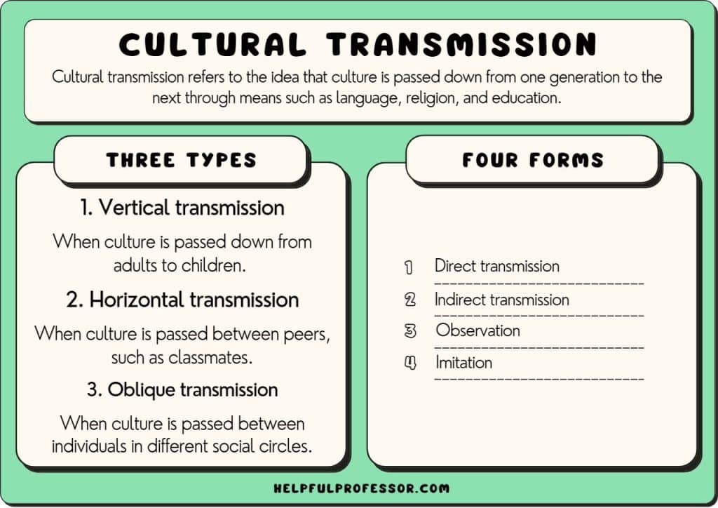 Definition: Cultural transmission refers to the idea that culture is passed down from one generation to the next through means such as language, religion, and education.