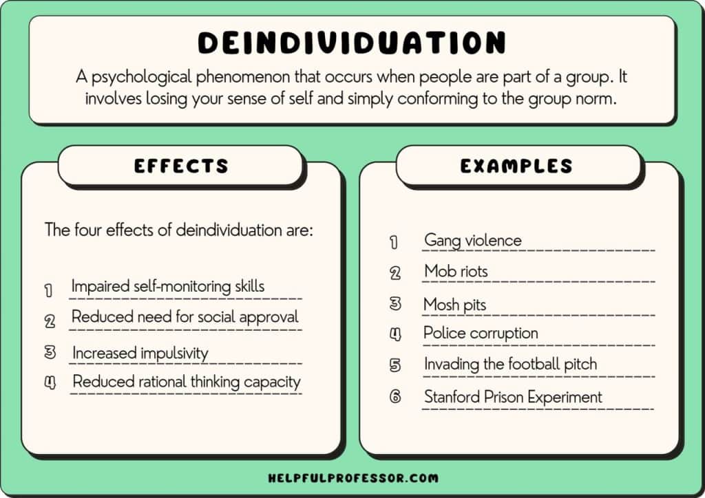 Definition: Deindividuation is a psychological phenomenon that occurs when people are part of a group. It involves losing your sense of self and conforming to the group norm without regard for morality.