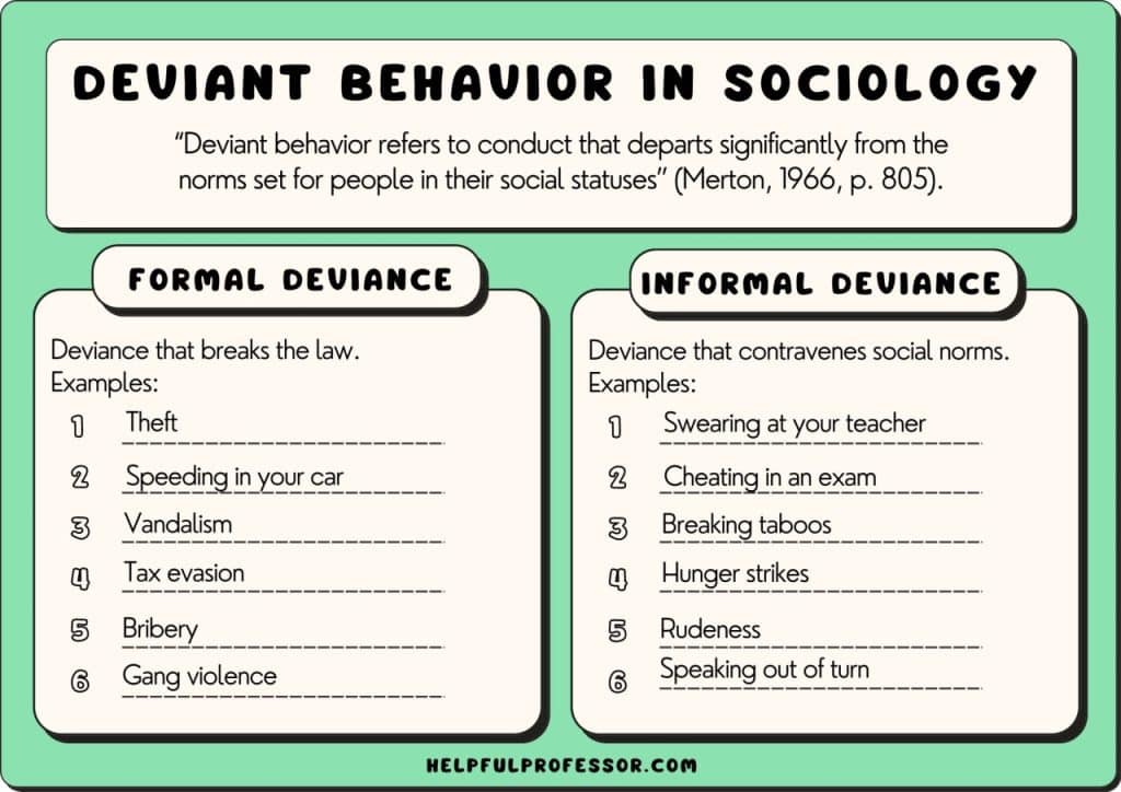 Definition: Deviant behavior is behavior that diverges from social and cultural norms. It can be formal (breaking the law) and informal (socially taboo).