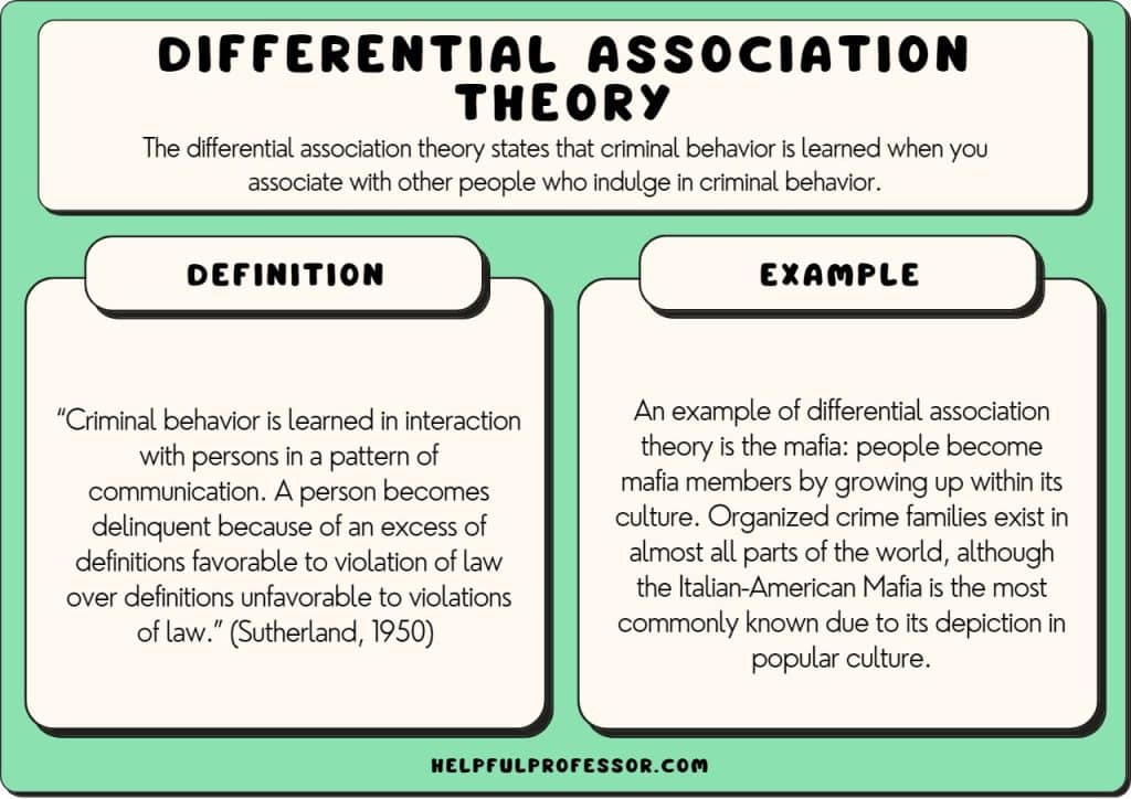 Definition: The differential association theory states that criminal behavior is learned when you associate with other people who indulge in criminal behavior.