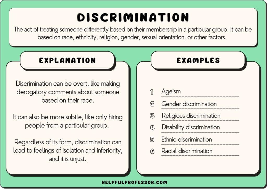Definition: The act of treating someone differently based on their membership in a particular group. It can be based on race, ethnicity, religion, gender, sexual orientation, or other factors.