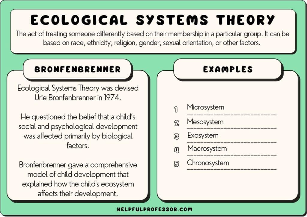 Definition: Bronfenbrenner’s ecological systems theory states that child development is influenced by a child’s interpersonal, social, and cultural settings.