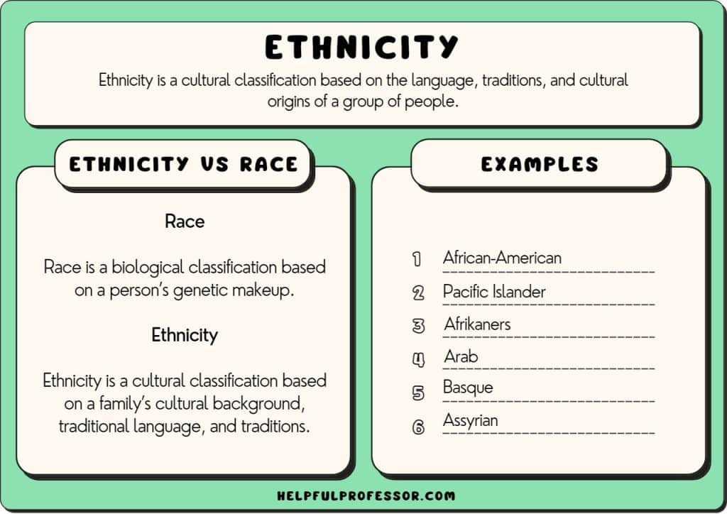 Definition: Ethnicity is a cultural classification based on the language, traditions, and cultural origins of a group of people.