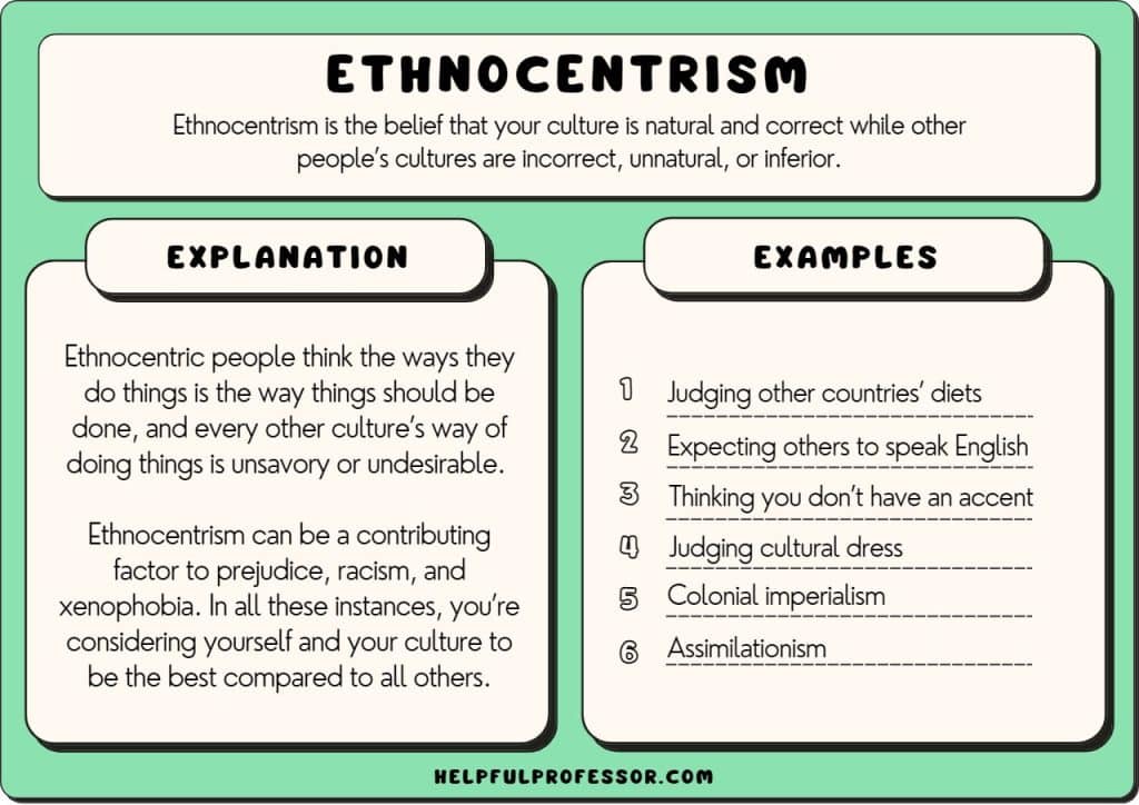 Definition: Ethnocentrism is the belief that your culture is natural and correct while other people’s cultures are incorrect, unnatural, or inferior.
