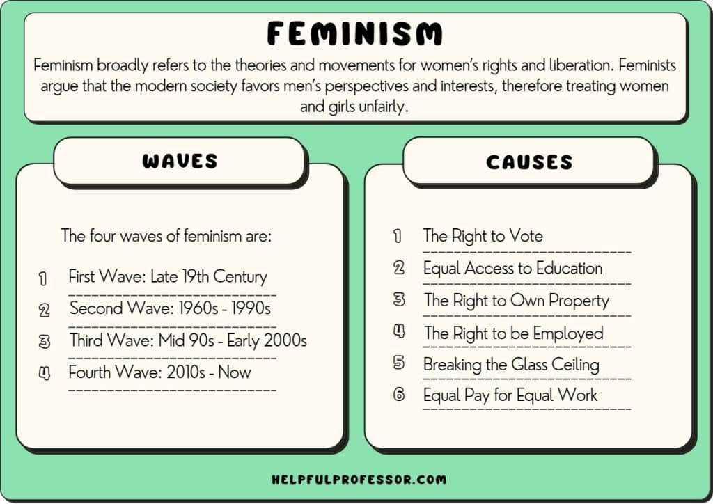 Definition: Feminism broadly refers to the theories and movements for women’s rights and liberation. Feminists argue that the modern society favors men’s perspectives and interests, therefore treating women and girls unfairly.