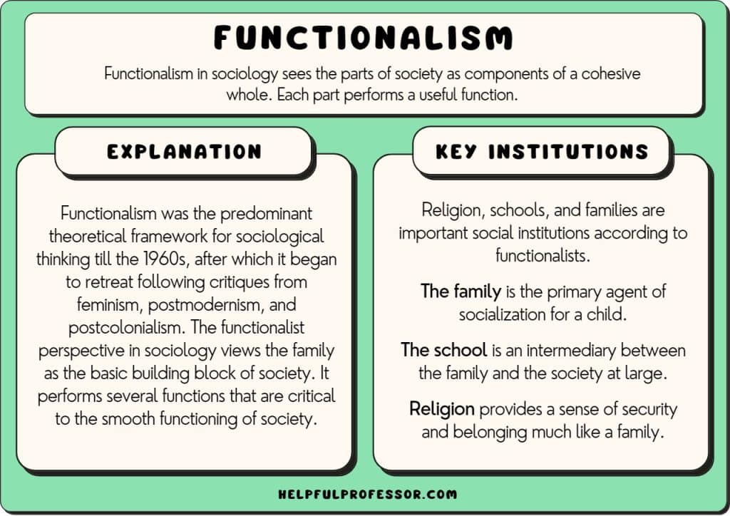 Definition: Functionalism in sociology sees the parts of society as components of a cohesive whole. Each part performs a useful function.