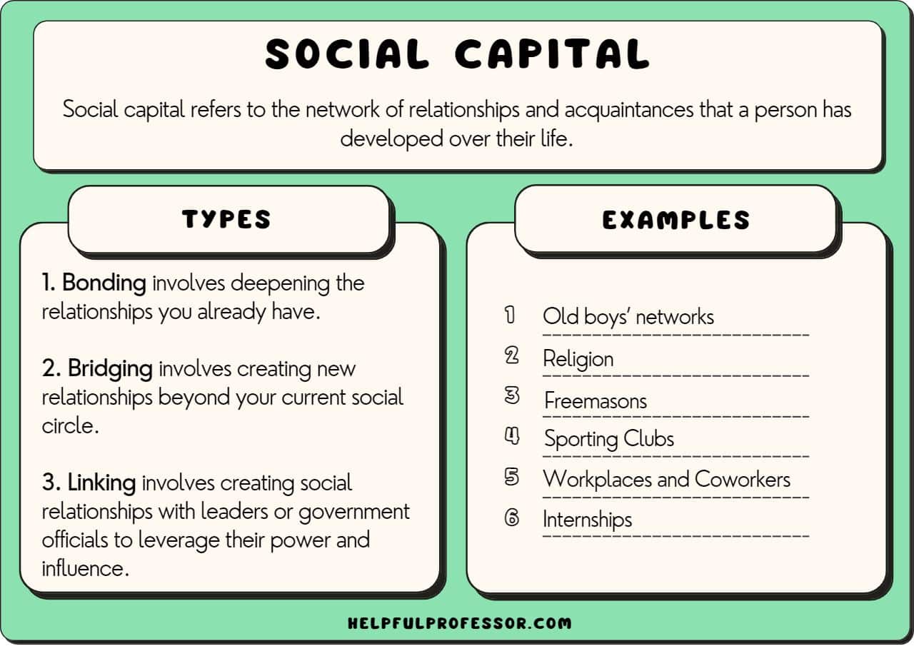 Definition: Social capital refers to the network of relationships and acquaintances that a person has developed over their life.