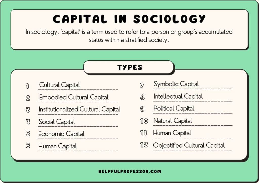 Definition: In sociology, ‘capital’ is a term used to refer to a person or group’s accumulated status within a stratified society.