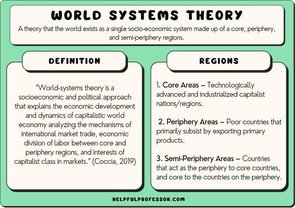 Definition: A theory that the world exists as a single socio-economic system made up of a core, periphery, and semi-periphery regions.
